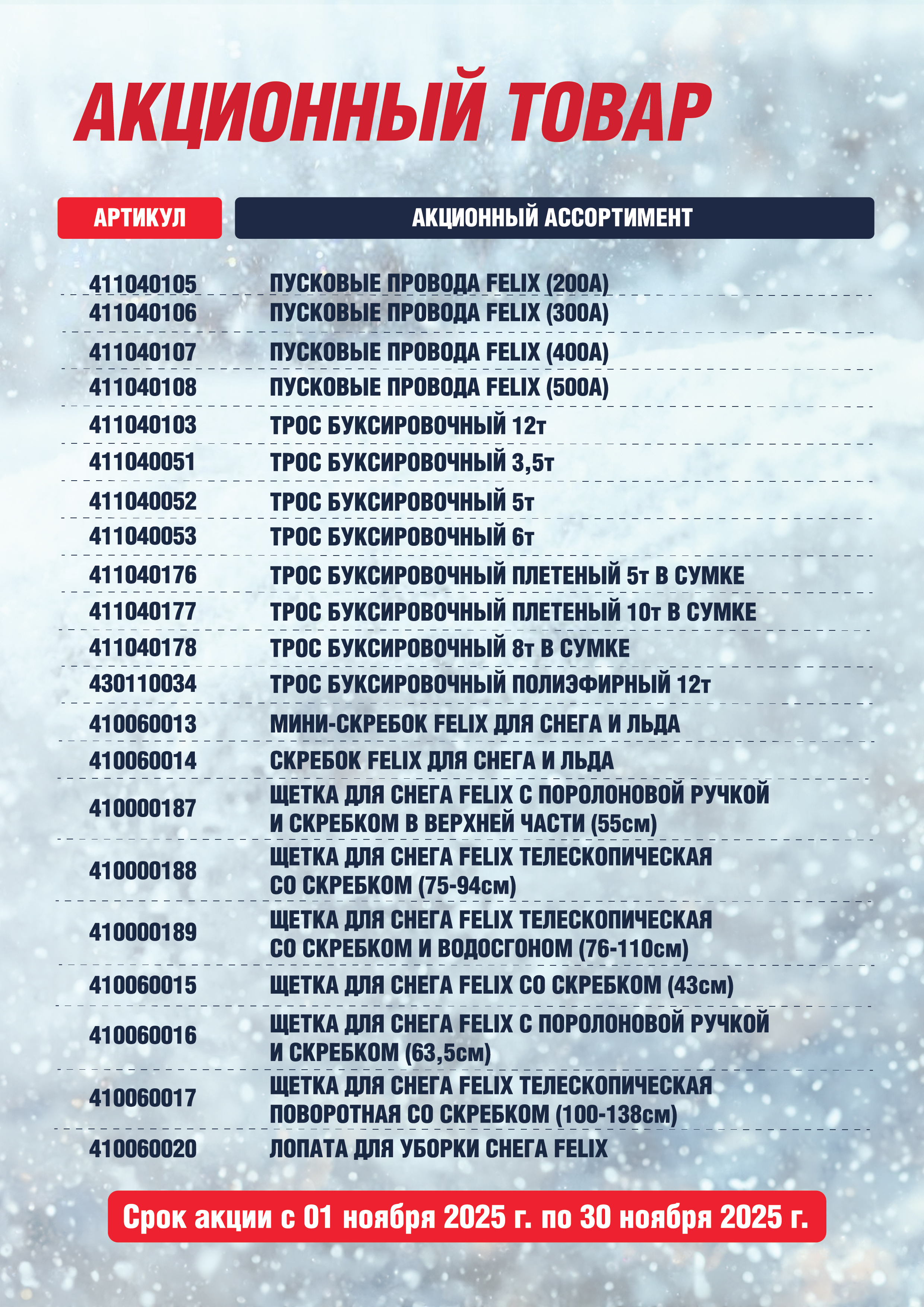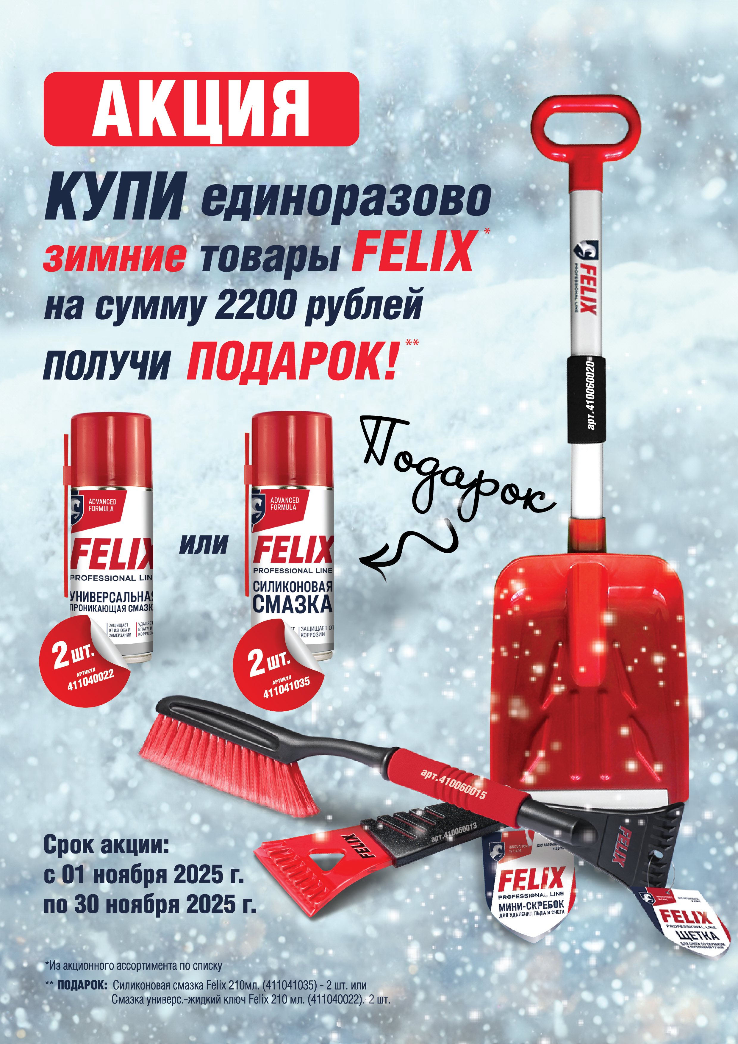 Механика акции: За единоразовый закуп зимних товаров Felix на сумму 2 200 руб. получи Силиконовую смазку Felix 210мл.
